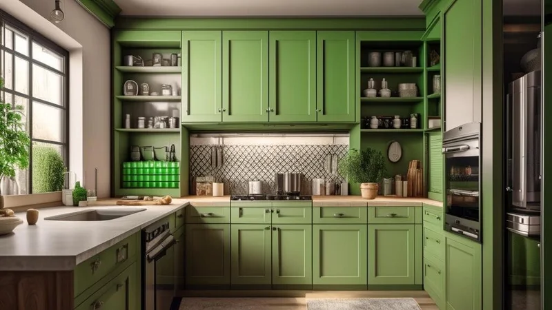 Кухня с оливковыми шкафчиками Источник фото: Создано: (ИИ) ПАО СберБанк©