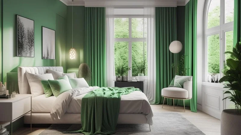 Спальня в бело-зеленых оттенках Источник фото: Создано: (ИИ) ПАО СберБанк©