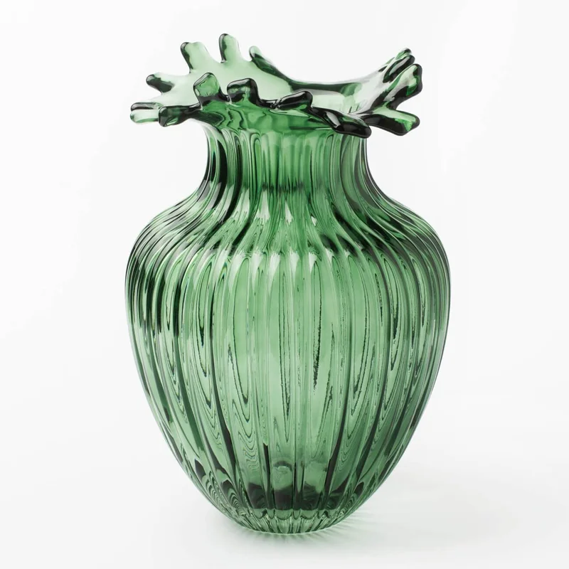 Стеклянная ваза в сочном оттенке весенней зелени – самая необходимая вещь в доме в сезон полевых цветов. Ну а необычный дизайн горлышка, напоминающий всплеск воды и разлетающиеся в разные стороны капли, точно привлечет внимание ваших гостей.