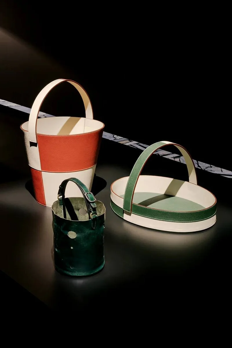 Шелк jockey украшен красочными геометрическими мотивами, вдохновившими на создание изделий из кожи и текстиля. Среди других предметов коллекции - плетеные из кожи ведра, корзины и центральные элементы стола.