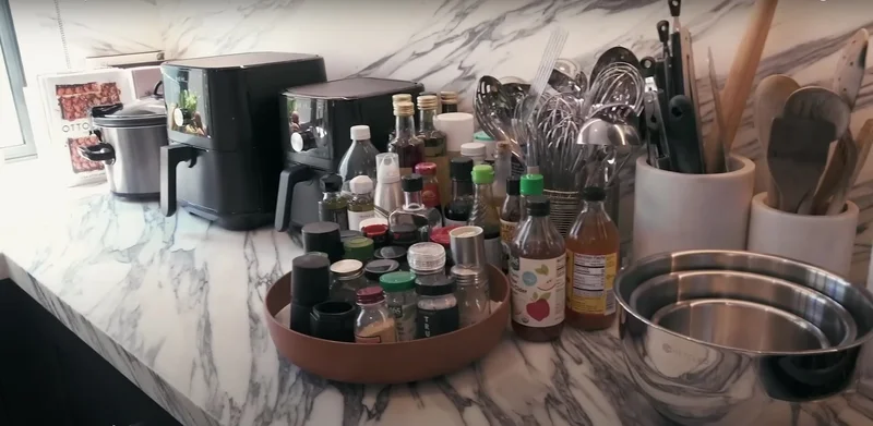 Презентацию Хейли начала с массивного духового шкафа и плиты, над которой ровно и аккуратно расставлены подписанные специи. Так как модель много готовит, ее кухня оборудована множеством удобных открытых полок, где хранятся масла, крупы и разнообразные приправы на любой вкус. Ну а на роскошной белой мраморной столешнице в хаотичном порядке расставлены соусы, уксус и полезные кухонные гаджеты, которыми модель активно пользуется: сразу две фритюрницы, кофеварка, матча-машина и мультиварка.