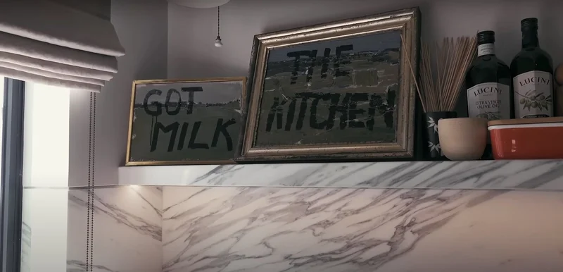 На открытой полке красуются картины с изображениями солнечных пейзажей в позолоченных рамах, на которых муж Хейли певец Джастин Бибер размашисто вывел «Got milk» и «The Kitchen»: «Мне нравится их история: они находились в другой части дома», — говорит модель. «Это были обычные картины, на них не было надписей, но мой муж решил придать им изюминку – получилось очень весело, и с тех пор они живут здесь».