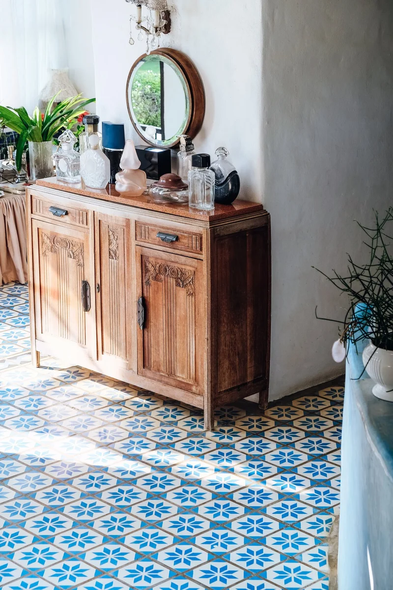 Традиционный пол в Средиземноморском стиле отделан каменной плиткой или керамогранитом. Он не только долговечен, но и выполняет весьма полезную функцию: охлаждает помещение в жару. Плитка обычно имеет насыщенный терракотовый оттенок, а порой еще и украшена традиционными узорами, которые придают всему пространству особый шарм. Если в вашей полосе не настолько жарко, чтобы выкладывать свой пол камнем, приобретите винтажный ковер в терракотовых оттенках специй – он привнесет теплые арабские нотки в ваш интерьер.