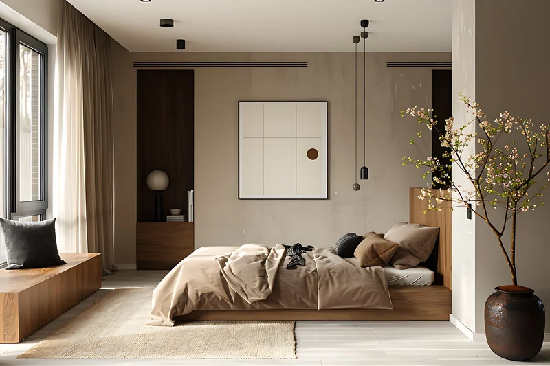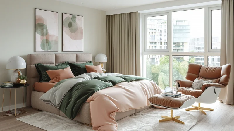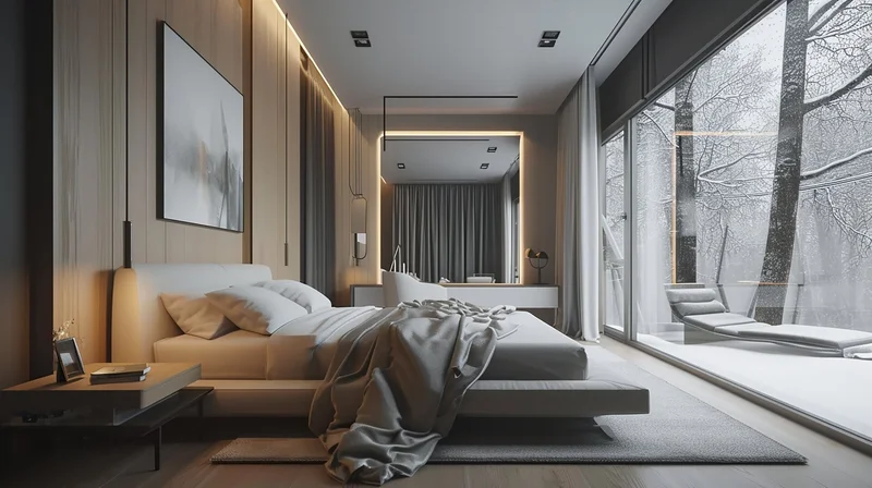 В спальне расположено много тяжелой мебели вроде кровати, шкафа для одежды и книжного стеллажа. Сочетание разных текстур придаст комнате мягкости, отточит прямые поверхности и сгладит углы.