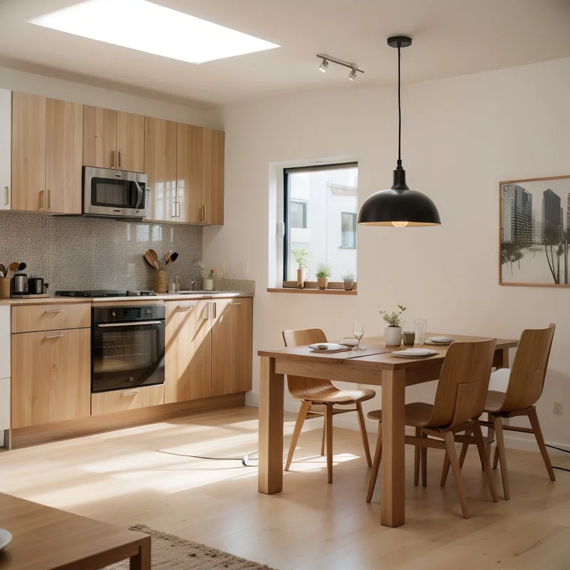 Если вы объединили кухню и комнату, стол можно поставить между ними. Как вариант, это может быть раздвижной стол, площадь которого, в случае прихода гостей, можно увеличить. Удобно и функционально.