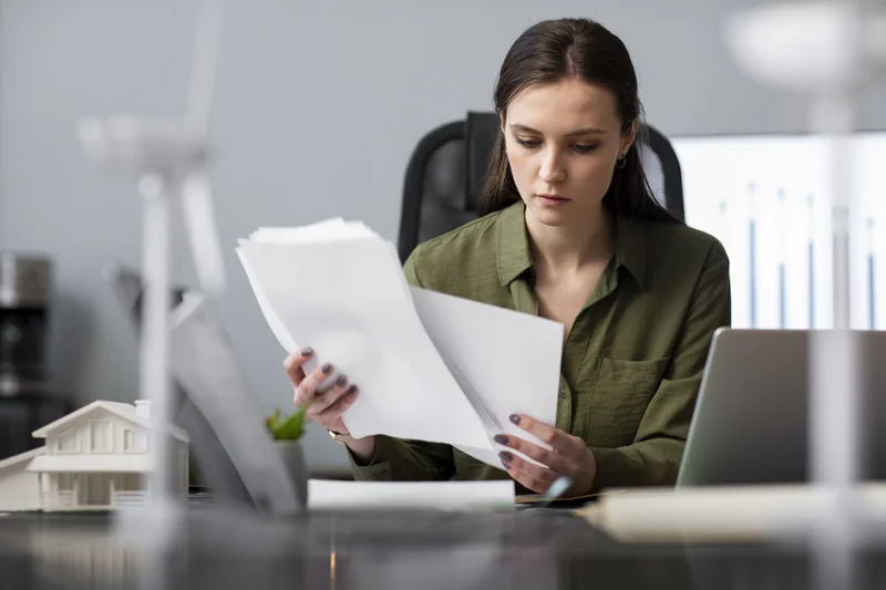Женщина изучает документы.
