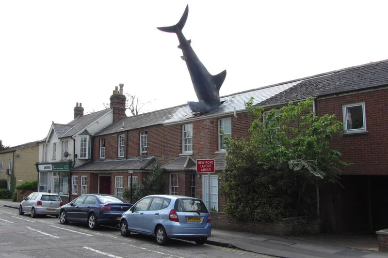На крыше этого дома в Хедингтоне, Оксфорд, установлена гигантская фигура акулы, как будто она врезалась в крышу. Этот уникальный дизайн был заказан владельцем дома Биллом Хейном в 1986 году. Акула сделана из стеклопластика и стала местной достопримечательностью и символом эксцентричного дизайна.