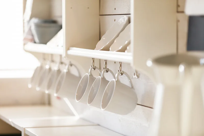 Красивые чашки на крючках в кухне. Источник фото: 123rf.com